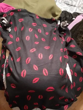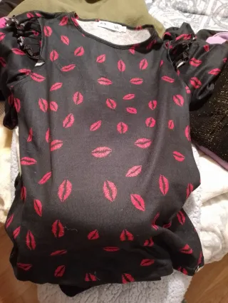 Camiseta de manga larga con un divertido estampado de labios rojos sobre fondo negro. - Diseño de labios rojos. - Manga larga. - Cuello redondo.