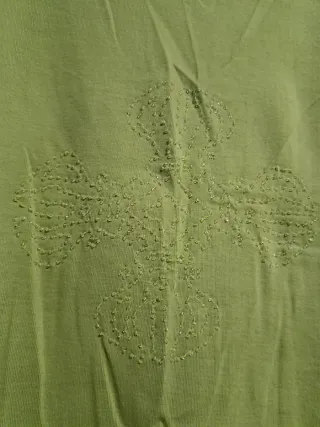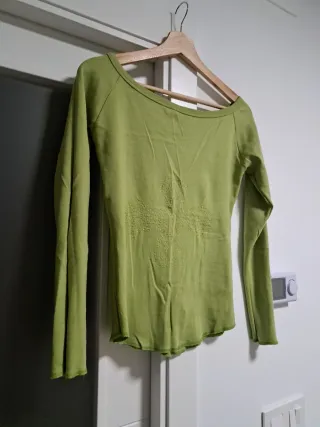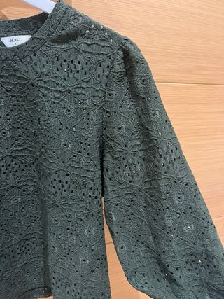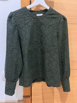 Camiseta de manga larga con un bonito diseño bordado. - Color verde botella. - Tejido con detalles calados. - Cuello redondo. - Puños ajustados - Frunce abullonado en hombros