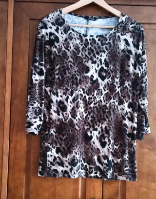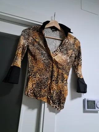 Camiseta con estampado de leopardo y detalles en negro. - Diseño cruzado. - Mangas largas con puños negros. - Cuello camisero.