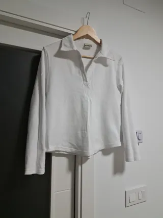 Camiseta blanca de manga larga con cuello tipo polo. - Cuello con abertura. - Manga larga.