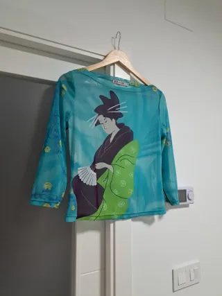 Camiseta de manga larga con un diseño llamativo. - Estampado de geisha y abanico. - Tejido ligero y translúcido. - Detalle de flores en las mangas.