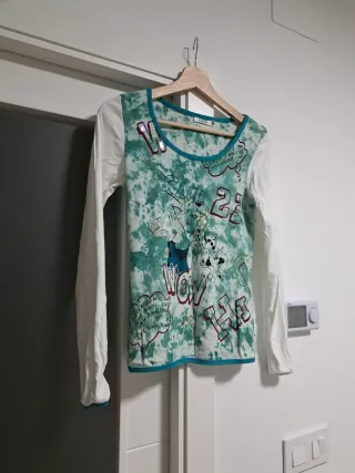 Camiseta de manga larga con un diseño original y llamativo. - Estampado de estilo collage con imágenes. - Detalle de pedrería en la parte inferior. - Cuello redondo. - medidas: largo 60 cm, ancho 43 ( de sisa a sisa)