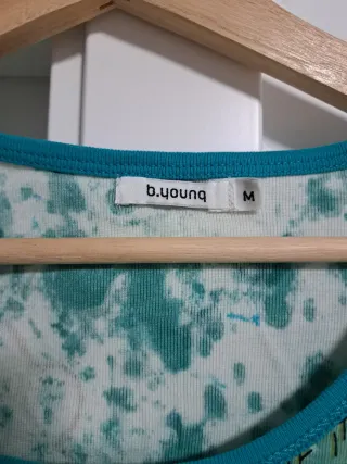 Camiseta de manga larga con un diseño llamativo y colorido. - Mangas blancas. - Cuerpo con estampado tie-dye verde y blanco. - Cuello redondo con ribete azul. - Estampado frontal con texto y dibujos estilo cómic.
