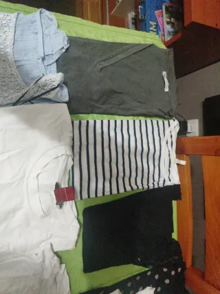 Lote de 11 camisetas variadas. - Camiseta de rayas finas blancas y azules. - Camiseta azul con detalles de encaje. - Camiseta gris oscuro. - Camiseta blanca con dibujo de oso. - Camiseta blanca con manga larga y detalles. - Camiseta blanca. - Camiseta de rayas finas blancas y negras. - Camiseta negra. - Camiseta de lunares blancos sobre fondo negro. - Camiseta blanca con estampado de puntos.