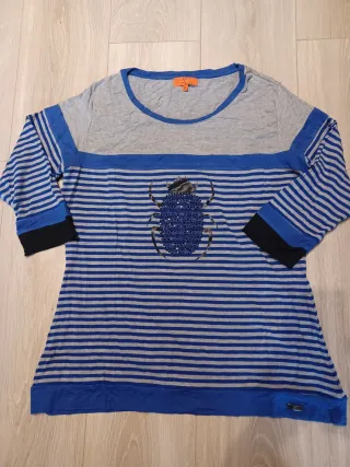 Camiseta de manga 3/4 con un diseño a rayas y un detalle de escarabajo en pedrería. - Rayas horizontales en azul y gris. - Detalle de escarabajo con pedrería en la parte delantera. - Mangas 3/4 con puños negros. - Cuello redondo.