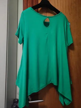 Camiseta de manga corta con un diseño moderno y un colgante a juego. - Camiseta de manga corta. - Incluye un colgante con detalles. - Corte asimétrico, con los laterales con caída Medidas : hombro 43cm y de largo 61cm Está nueva, no tiene etiqueta pero nunca se ha usado