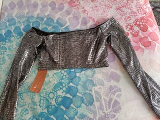 Top plateado con un diseño llamativo y moderno. - Escote Bardot. - Mangas largas acampanadas. - Tejido con textura de escamas.