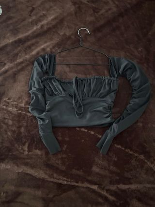Camiseta corta de manga larga con un tacto suave y brillante. - Material: Terciopelo. - Corte: Crop top. - Mangas: Largas.