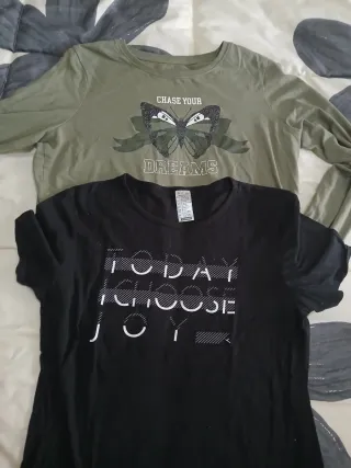 La camiseta de rayas (talla S) esta practicamente nueva ya que solo se ha puesto una vez. La camiseta negra (talla M) está nueva (sin uso).