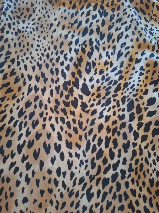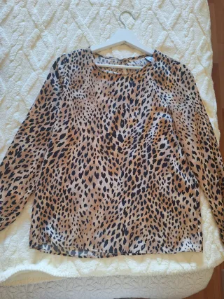 Vendo camiseta o top con animal print. Escote en pico decorado con cuentas metalicas Largo total 63 cm. Contorno de pecho 106 cm. Contorno en la parte de abajo 80 cm. Distancia del cuello a la parte final de la manga 53 cm. Como nueva.