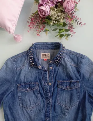 Camisa vaquera de manga larga con detalles de tachuelas en el cuello - Cuello camisero. - Cierre de briches - Dos bolsillos en el pecho. - Puños que se pueden recoger. Marca ONLY talla XS 34 Impecable, como nueva