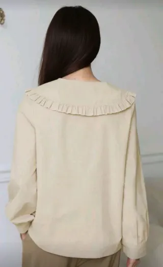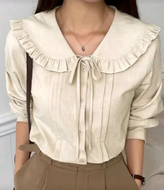 Camisa de estilo vintage con un diseño de baberos y cuello con volantes. - Material: Algodón. - Cierre de botones. - Detalle de lazada en el cuello. - Mangas largas.