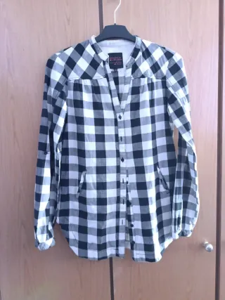Camisa larga a cuadros blanca y negra de manga larga pero también con botón en las mangas para hacerla francesa, bolsillos en el delantero
