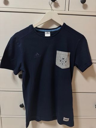 Camiseta de manga corta con el escudo del Real Madrid. - Logo de Adidas bordado en el pecho. - Bolsillo en el pecho con diseño. - Detalle RMFC en la parte inferior. - 68 cm largo x 42 cm ancho (axila a axila).
