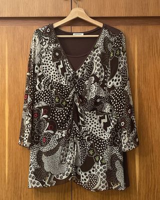 Blusa de mujer con un diseño llamativo y vibrante. Perfecta para añadir un toque de color a tu armario. -Manga larga. - Estampado abstracto con detalles en blanco, marrón y toques de color. - Cuello en V cruzado con detalle de nudo. -Talla SG/XL Medidas : Hombros 45 Largo 70 Largo manga 52