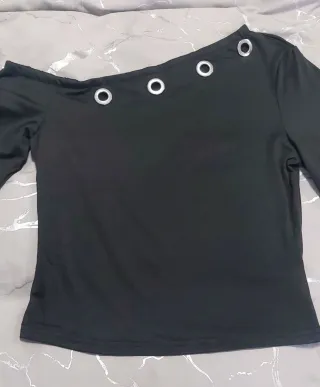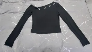 Camiseta de manga larga con un diseño moderno y detalles de ojales metálicos en el escote asimétrico. Es corta, a la cintura y elástica. Queda muy chula con un hombro descubierto y la tela es muy suave y calentita. Esta sin estrenar. - Diseño de escote asimétrico. - Ojales metálicos decorativos.