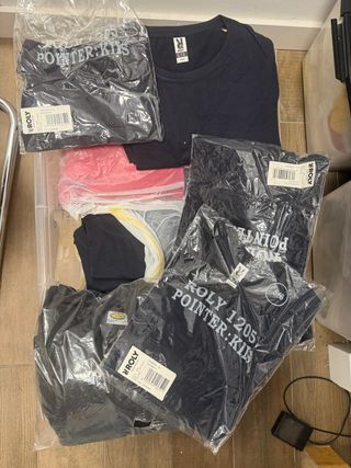Se vende lote completo de aproximadamente 180 prendas NUEVAS sin usar. Incluye: -Unas 120 camisetas de algodón manga corta (adulto y niño) -Unas 50 camisetas técnicas de colores variados -10 sudaderas adulto (blancas y azules) Muchas prendas aún en su bolsa original. Ninguna se ha usado. Marcas tipo Roly. Tallas variadas.Incluye etiquetas originales. SE VENDE TODO EL LOTE JUNTO. Escucho ofertas RAZONABLES.