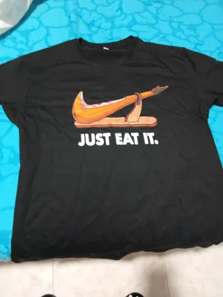 Camiseta de manga corta con un diseño divertido. - Estampado gráfico de jamón con el logo de Nike modificado. - Frase JUST EAT IT. debajo del estampado. Ideal para regalos,fiestas,cumpleaños,san Valentín,reyes, navidades,sorpresa,Nike,jamón,just donde it...