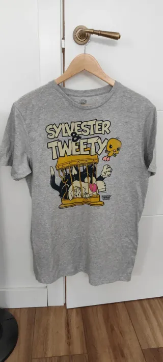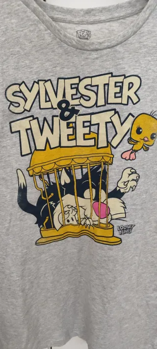 Camiseta gris con estampado de Sylvester y Tweety de Looney Tunes. - Diseño divertido con los personajes. - Estampado frontal. - Cuello redondo y manga corta.