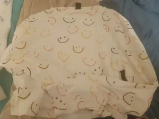 Camiseta corta de manga larga con un divertido estampado de sonrisas en color naranja, marrón, negro y amarillo. Aunque sea talla XL, talla pequeño. Así que recomiendo para una talla L. -Posibilidad en mano: Madrid. -Disponible envío por correo. Pregunta sin compromiso.