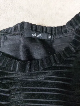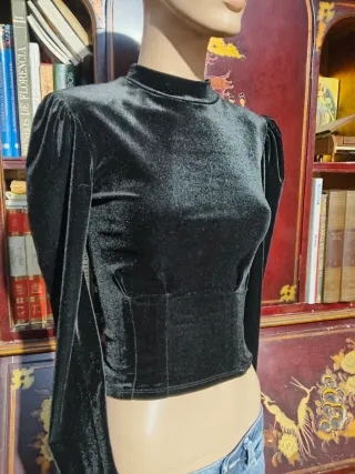 Camiseta de terciopelo con un diseño asimétrico y detalles brillantes. Es una prenda elegante y llamativa. - Tejido de terciopelo suave. - Diseño de un solo hombro. - Adornada con pequeños brillos. - Talla M.