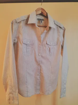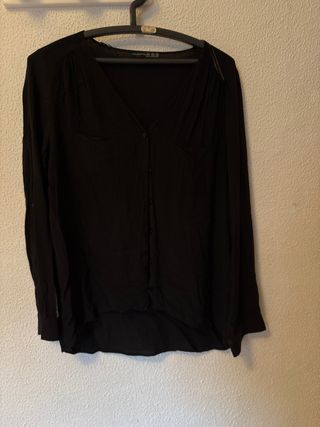 Camisa negra de manga larga, ideal para el verano. Presenta un diseño elegante y ligero. Solo hay que plancharla está arrugada de estar guardada - Cuello en V. - Cierre de botones. - Dos bolsillos en el pecho