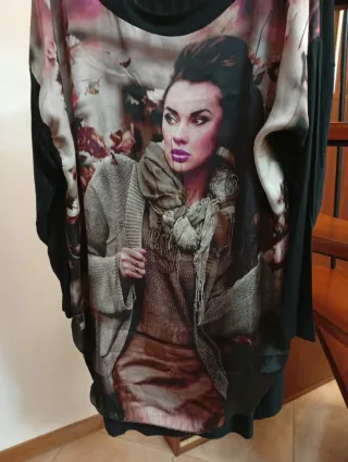 Camiseta de manga larga con un llamativo estampado frontal. - Diseño con imagen de mujer y detalles florales. - Mangas y espalda en color negro. - Tejido ligero y fluido.
