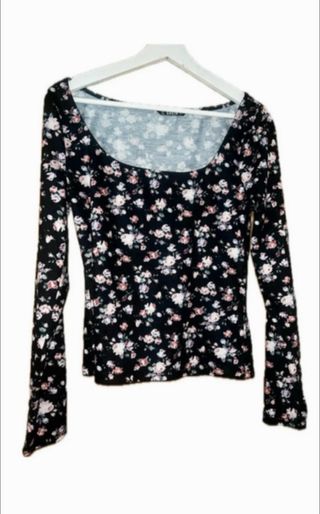 Camiseta de manga larga con un estampado floral sobre fondo negro. El escote es cuadrado. • Largo: 52cm. - Estampado de flores en tonos rosas y blancos. - Escote cuadrado.