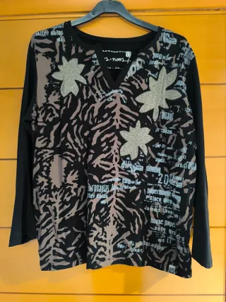 Camiseta de manga larga con un diseño llamativo y original. Axila axila 55cm largo 60 cm - Estampado con motivos vegetales y texto. - Detalles brillantes en forma de hojas.