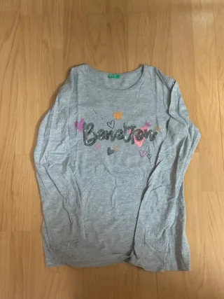 Camiseta de manga larga con un diseño divertido. - Color gris con detalles en rosa y naranja. - Estampado frontal con el logo de Benetton y corazones.