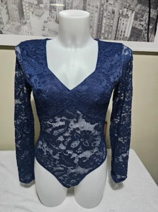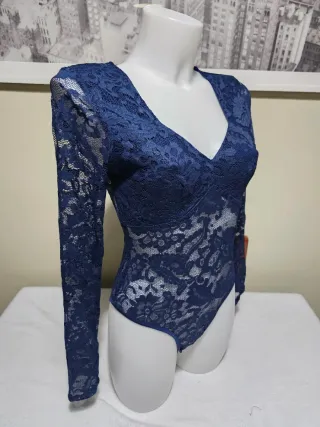 Body de encaje con manga larga en un bonito tono azul marino. El diseño es elegante y el tejido es delicado. - Encaje floral. - Manga larga. - Escote en V.