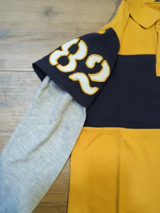Camiseta de manga larga con cuello polo para niño de la marca Gap. Presenta un diseño a rayas en color azul marino y amarillo. Talla 8 años - Mangas grises. - Detalle de número 82 en la manga izquierda. - Cierre de dos botones en el cuello.
