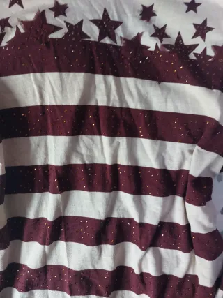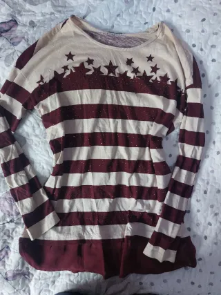 Camiseta de manga larga con un diseño de rayas y estrellas. - Diseño de rayas en granate y beige. - Estrellas decorativas en la parte superior. - Detalle de purpurina en las estrellas.