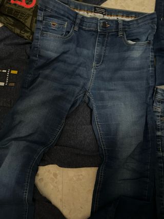 Conjunto de ropa que incluye camisetas de manga larga y pantalones. - Camiseta verde con logo Benetton en rojo. - Camiseta azul marino con detalles amarillos y blancos. - Tres pantalones vaqueros de diferentes tonos de azul.