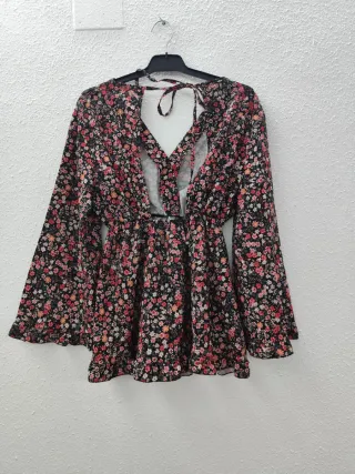 Blusa de flores con lazada en la espalda, y espalda al aire, con las mangas anchas. Talla como una M/L
