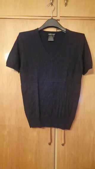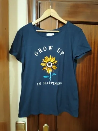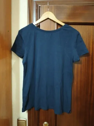 Camiseta azul marino, de Springfield, talla L. En perfecto estado. Poco uso. Medidas: ancho de pecho 50 cm, largo 64 cm. Lleva lentejuelas. De algodón. Hago envíos. En persona se entrega en la puerta del Domino's pizza de Avda Puente del Pilar.