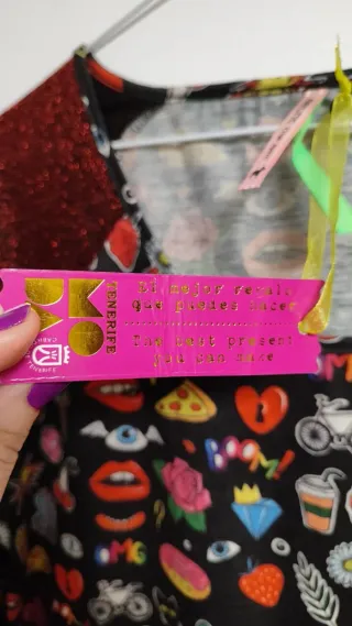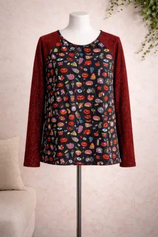 Camiseta de manga larga con un estampado divertido y original. Las mangas tienen un acabado brillante. - Diseño con múltiples estampados. - Mangas largas con brillo.