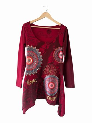Túnica estilo túnica de la marca Desigual con un vibrante estampado. - Diseño con mandalas y motivos florales. - Detalle de texto love y Desigual bordado. - Mangas largas. - Corte asimétrico en el bajo.