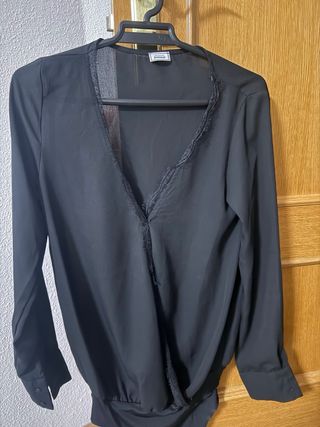 Body negro de manga larga con escote en pico y detalle de encaje. - Tejido ligero y transparente. - Cierre de botones en la parte inferior. - Diseño cruzado en la parte delantera.