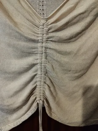 Precioso top en color crema, tejido de punto fino en nylon y viscosa. Escote en V, mangas acampanadas y cordón en el centro para llevarlo más subido o menos. Es una talla M, pero da bastante más talla. Yo diría que se puede usar desde una 40 hasta una 48. Comprobar medidas ⬇️ - Hombros: 48 cm - Ancho: 50 cm, estira hasta 65. - Largo: 43 cm * Descuento por lote * ** No puedo desplazarme, sólo envío o recogida en mi domicilio**