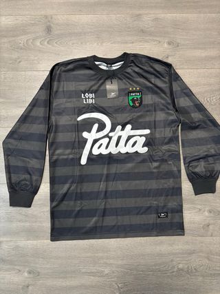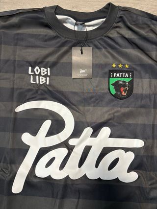 Camiseta de manga larga Patta en color negro con franjas tono sobre tono, un diseño icónico y muy buscado dentro del streetwear. Pieza totalmente nueva con etiqueta, perfecta para coleccionistas y amantes de la marca. Incluye detalles bordados de alta calidad como el texto “Lobi Libi” y el escudo Panther con estrellas, además del logo grande Patta en el pecho. El tejido tiene un acabado técnico estilo jersey deportivo, muy cómodo y con caída ligera. Una prenda difícil de encontrar en esta talla y en estado impecable, ideal tanto para vestir como para colección. #Patta #PattaAmsterdam #Streetwear #PattaJersey #LobiLibi #PattaPanth