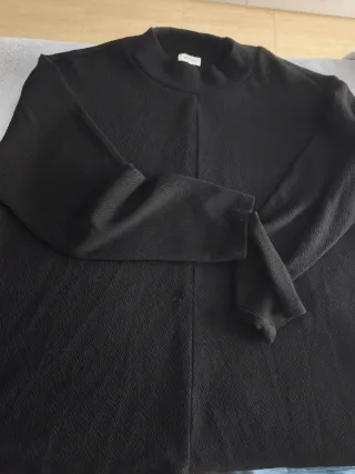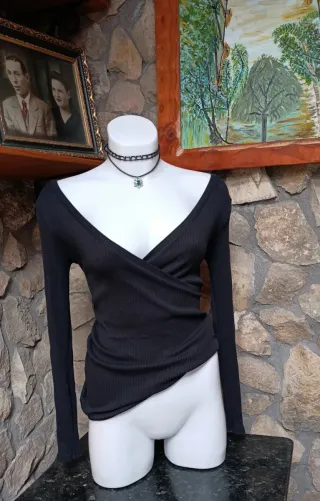 Camiseta de manga larga en color negro, confeccionada en un tejido de canalé fino muy suave y elástico que se adapta perfectamente a la silueta. El detalle principal es su escote asimétrico con tiras cruzadas, que le da un toque moderno y sofisticado, ideal tanto para un look casual con vaqueros como para algo más arreglado. Estado: Nuevo con etiquetas. Talla: L (EUR) / 32 (MEX). Color: Negro intenso. Tejido: Canalé elástico de alta calidad. Medidas aproximadas (tomadas en plano) Largo total: 55 cm aproximadamente (desde el hombro hasta el bajo)