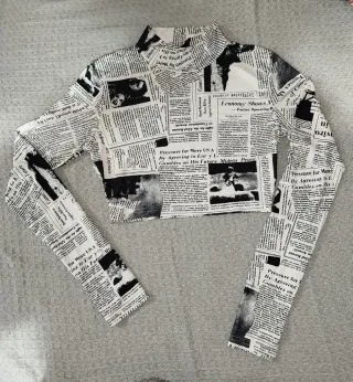 Top de manga larga con un diseño llamativo inspirado en periódicos. - Estampado integral de texto y titulares. - Cuello alto. - Mangas largas. - Tacto licra suave