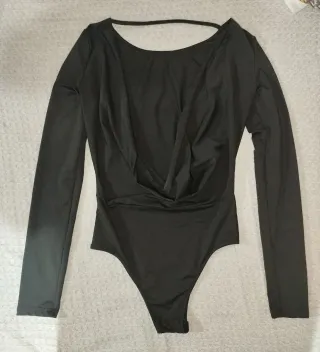 Body negro de manga larga con escote en la espalda. - Diseño elegante y versátil. - Tejido suave y cómodo. - Escote de la espalda drapeado