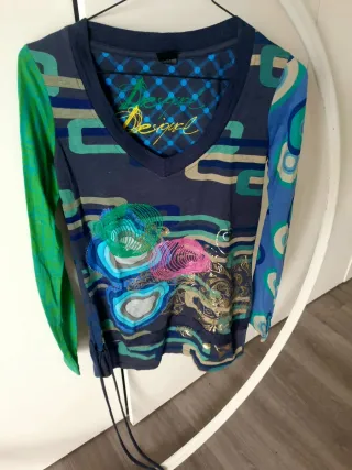 Camiseta de manga larga con un diseño vibrante y original de Desigual. Presenta un cuello en pico y un estampado llamativo. Según la persona, se puede utilizar de vestido - Estampado abstracto con formas orgánicas y líneas. - Detalles bordados en relieve. - Combinación de colores vivos y tonos tierra.