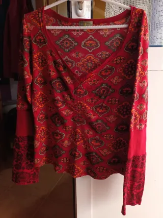 Blusa con estampado floral y manga larga. - Diseño con escote de pico y cordones. - Estampado de flores y ramas en tonos tierra y verdes. - Tejido ligero y fluido. Hago envíos o entrego en Alicante, zona pla de la vallonga, no me desplazo