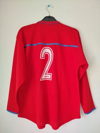 Camiseta muy rara del Getafe del año 2005. Es original, en su versión de manga larga para jugadores. Patrocinador: PSG. Talla: M. Pequeño defecto de un hilo en el pecho.
