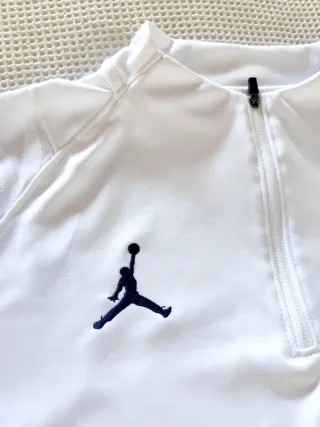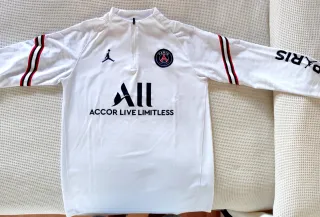 Camiseta de entrenamiento del Paris Saint-Germain con manga larga. Talla M. Casi sin usar. - Diseño en color blanco. - Logo de Jordan y escudo del PSG. - Inscripción ACCOR LIVE LIMITLESS en el frontal. - Detalles de rayas en las mangas.
