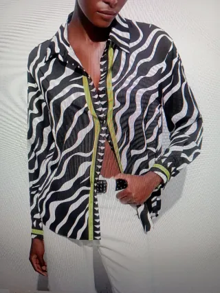 Camisa de estilo vintage con un llamativo estampado de cebra. 90-94 pecho 95-99 caderas - Diseño de cuello camisero. - Manga larga. - Cierre de botones. - Detalles de ribete en color verde lima.