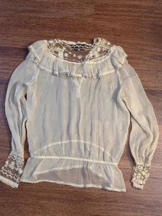Elegante blusa de Zara con detalles de encaje. - Cuello alto con volantes. - Cierre de botones. - Mangas largas con puños de encaje. - Bajo con volante.